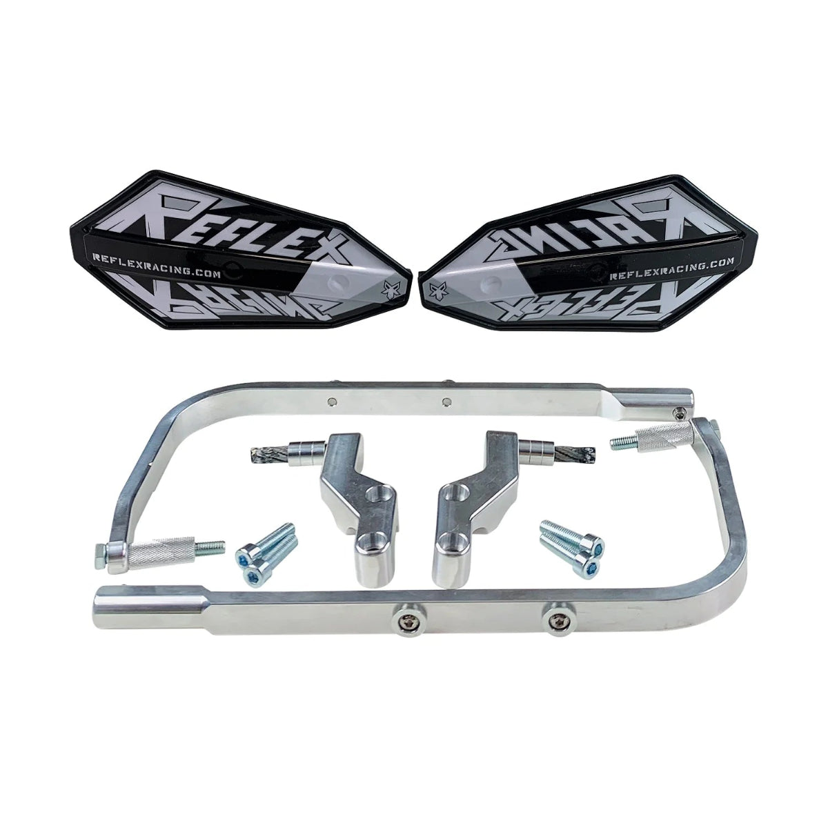 Reflex Racing Handguards have combined flexibility and durability, these guards are constructed of 6061 billet aluminum for standard and oversize dirt bike, snow bike bars they adjust and accommodate widths from 29" to 32". Complete set includes a pair of inner mounts, guard bars, plastic shields with graphics, all mounting hardware and instructions.
