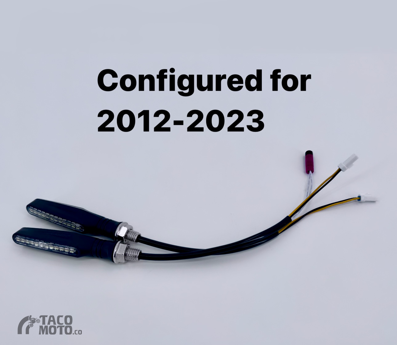 These signals pair with the 24+ tidy tail kit and are wired with the correct bullet connectors to plug directly into the Taco Moto Co headlight switch.